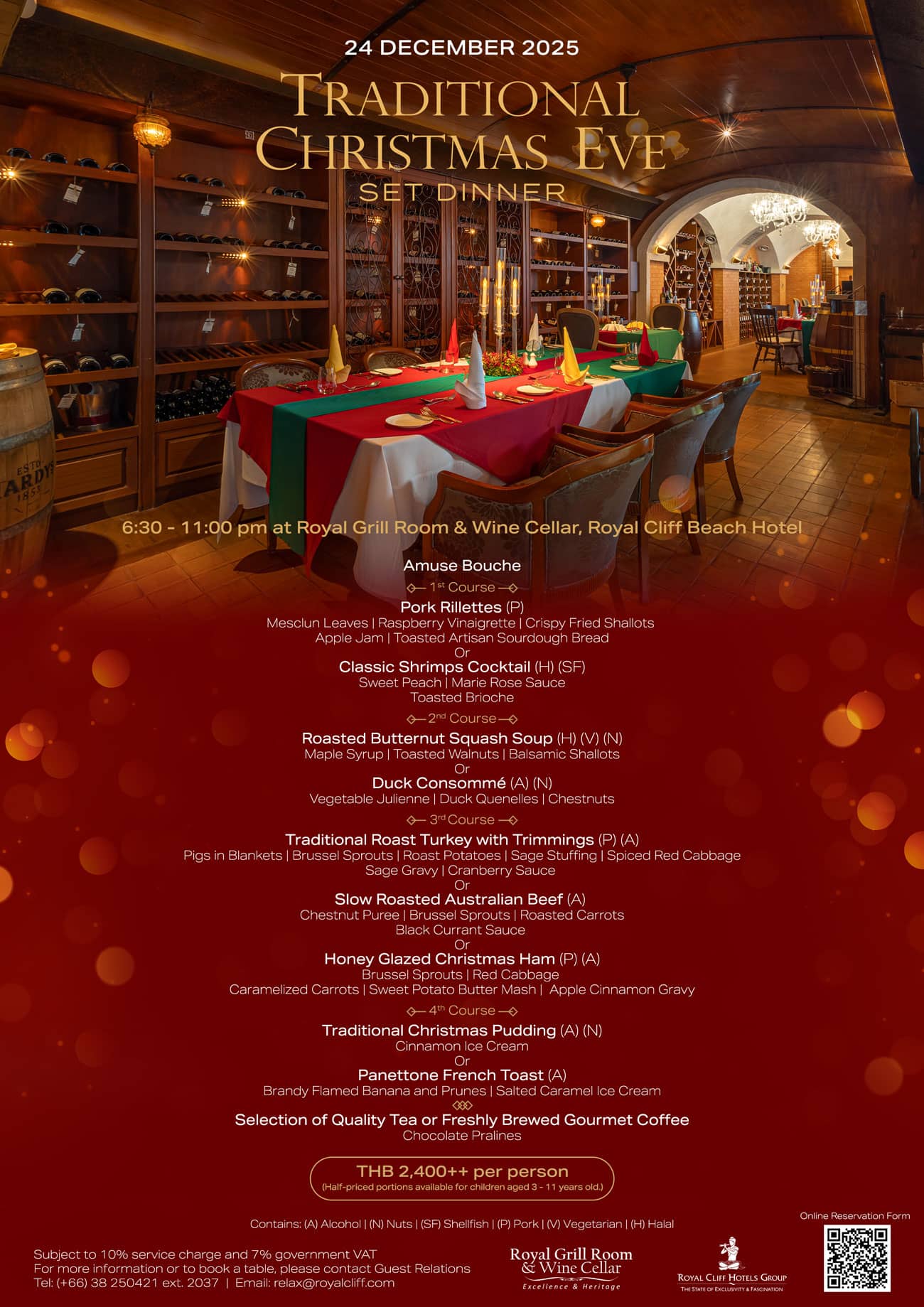 At present, all tables for the Christmas Eve Dinner are fully booked. However, if you wish to celebrate on Christmas Day, we invite you to join our Christmas Day Lunch Buffet on 25 December 2025. For more information and to reserve your table, please visit www.royalcliff.com/christmas-day-lunch-buffet/.