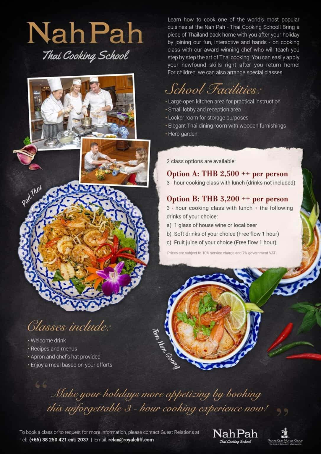 For those who are seeking a Thai cooking class in Pattaya, look no further than Nah Pah Thai Cooking School at Royal Cliff Grand Hotel. Teaching the art of Thai cuisine since 2000, culinary traditions meet modern instruction in the state-of-the-art facility at our Pattaya hotel. Our fun and immersive Thai cooking class takes place over the course of 3 hours and transforms passionate food lovers into skilled practitioners of authentic Thai cooking.