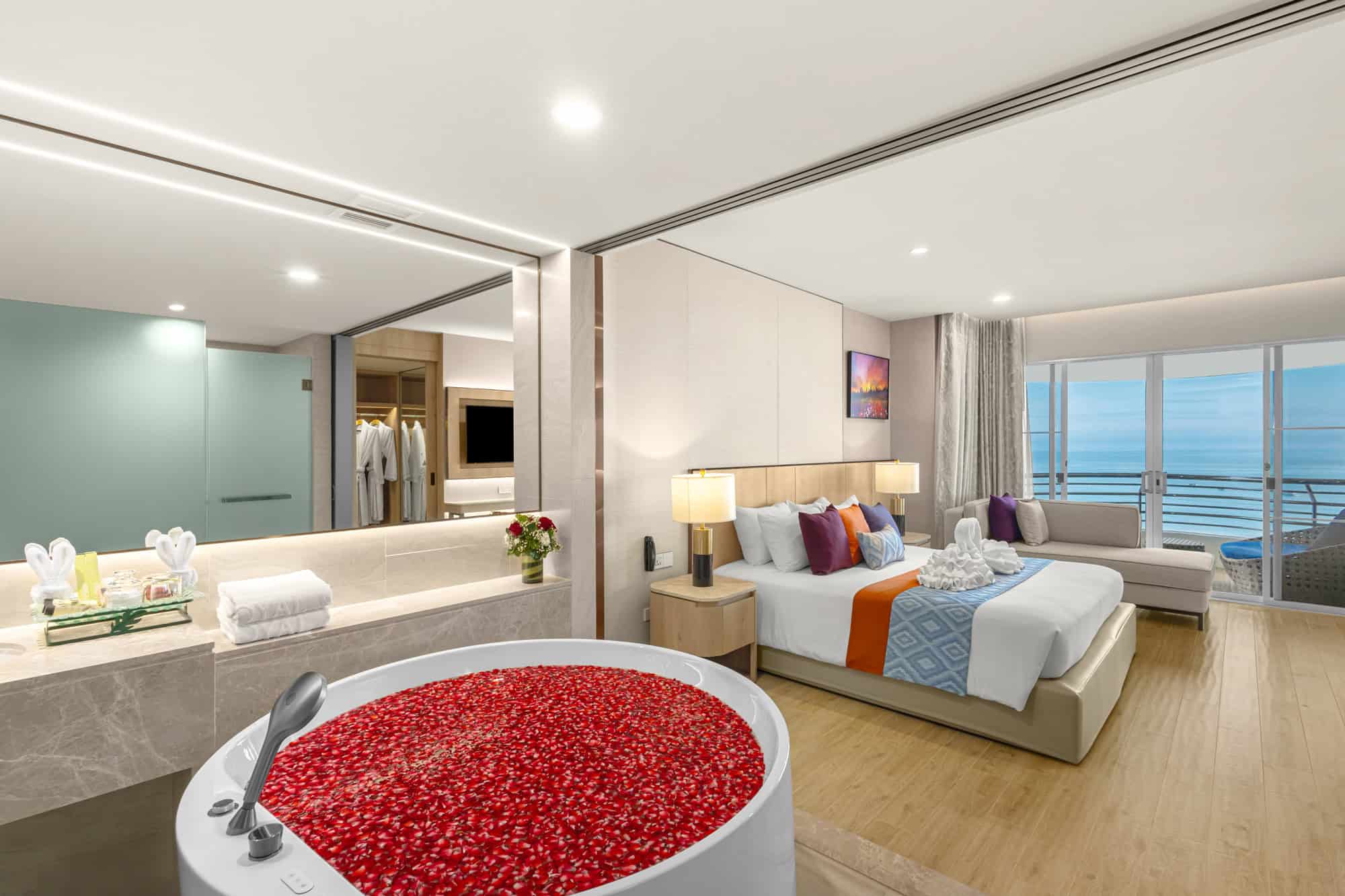 Exotic Thai inspired interiors are elegantly brought up to date with modern conveniences in our gorgeous one-bedroom Regency Suite. This ocean view suite is impeccably finished with fine wood detailing and polished natural stone floors, the foyer leads invitingly to a beautifully spacious sitting and dining area with a separate guest powder room. The large master bedroom is perfect for rest and rejuvenation with a king-size bed and luxurious en suite marble bathroom fitted with double vanity, rain shower and Jacuzzi. The living room and master bedroom open up to huge private balconies so you can step out for spectacular views of sunrises and sunsets over Pattaya beach whenever you please.