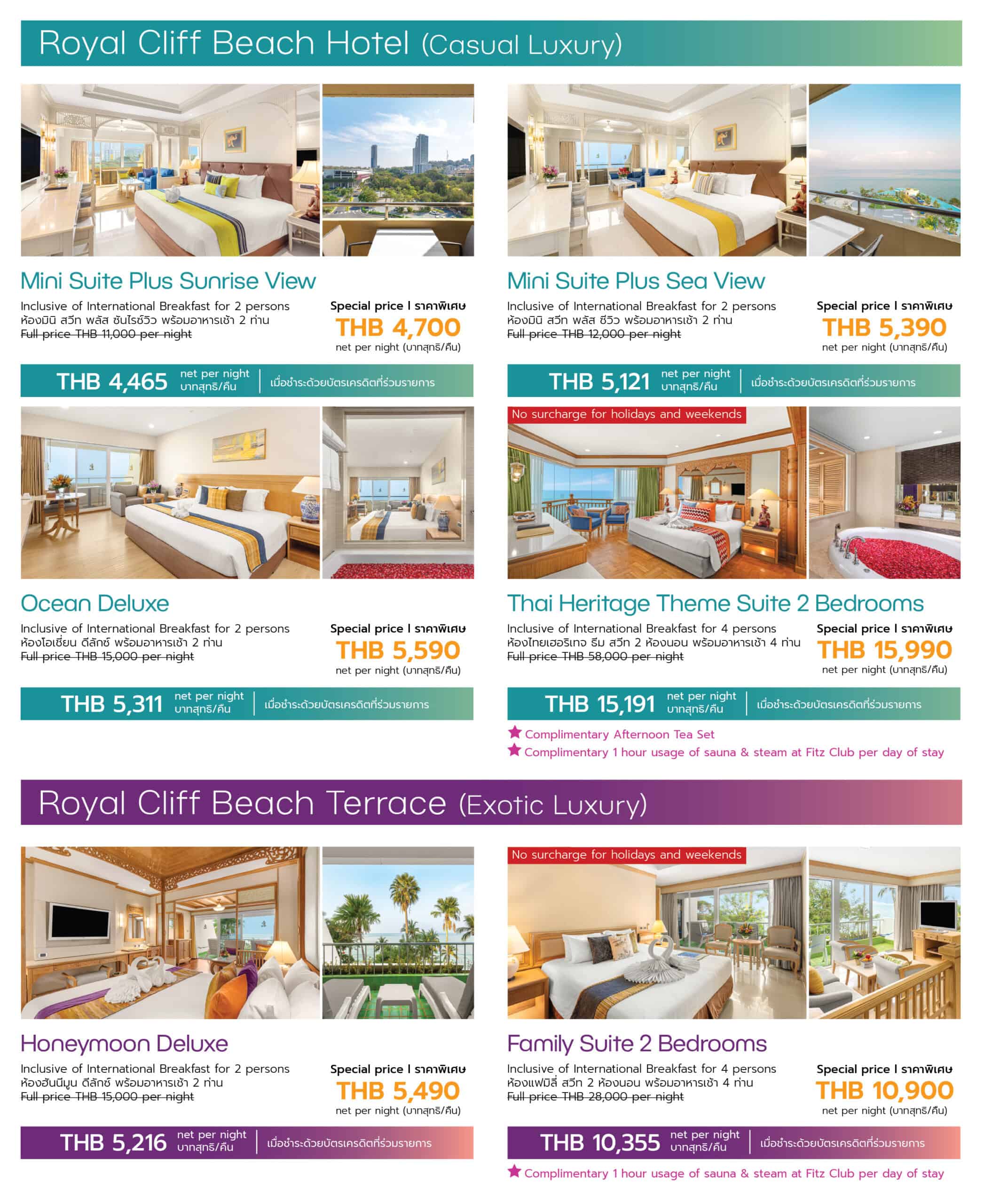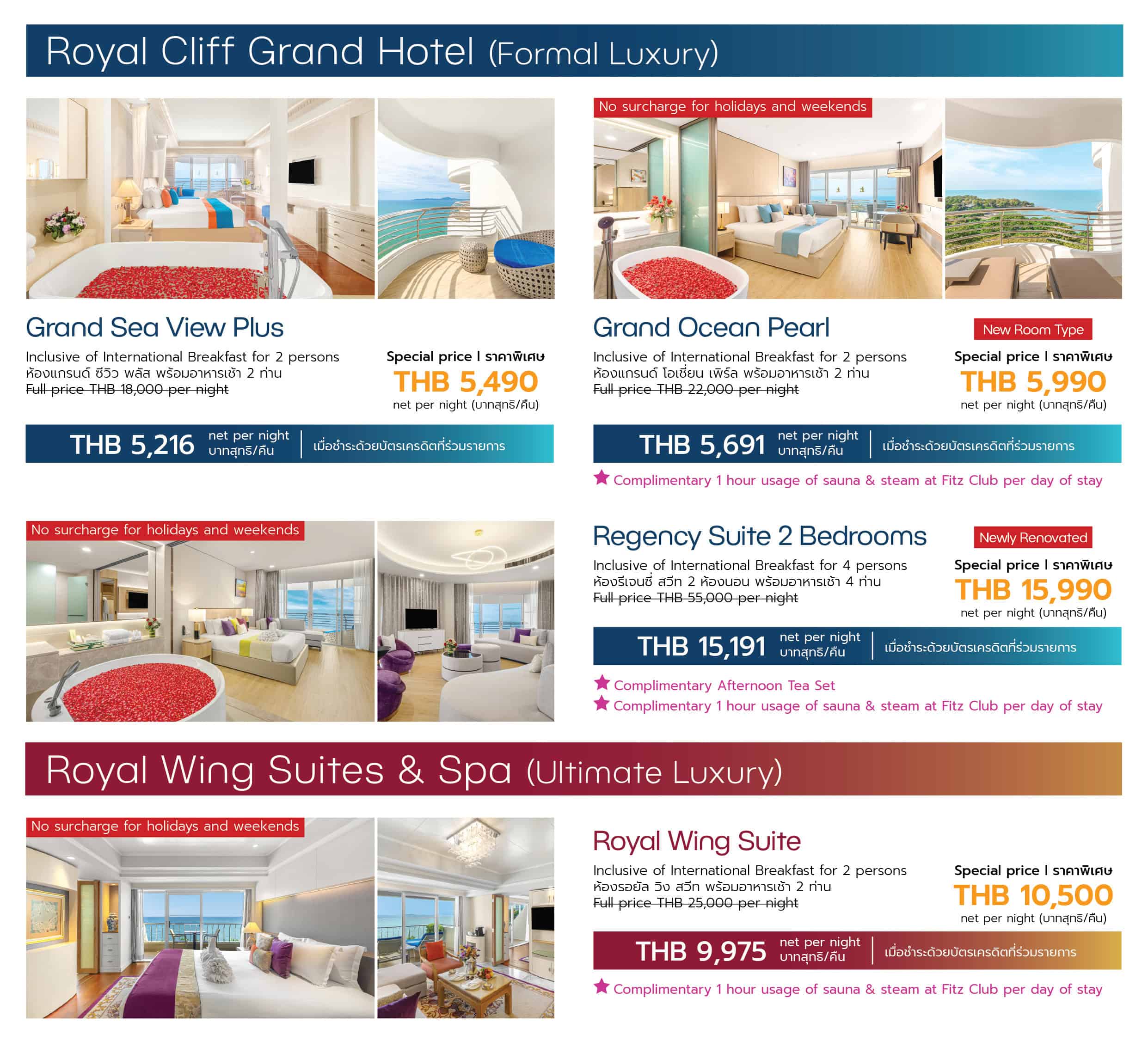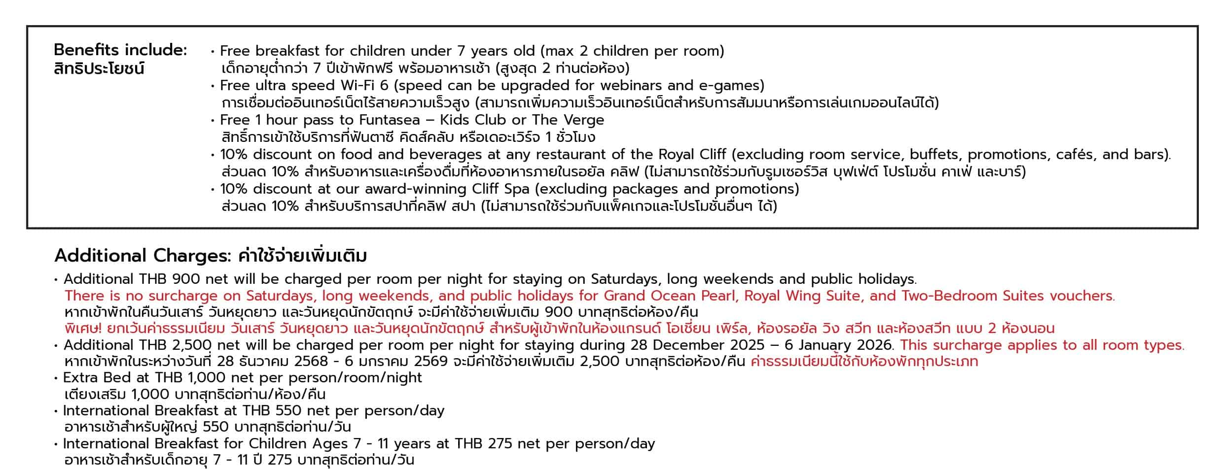• Food and Spa Voucher: Prior reservation is required to redeem the hotel voucher. Guests must contact the hotel’s Guest Relations department directly to make a booking at [email protected], Line ID @Royalcliff, or +66 (0) 38 250 421. Redemption is subject to availability.